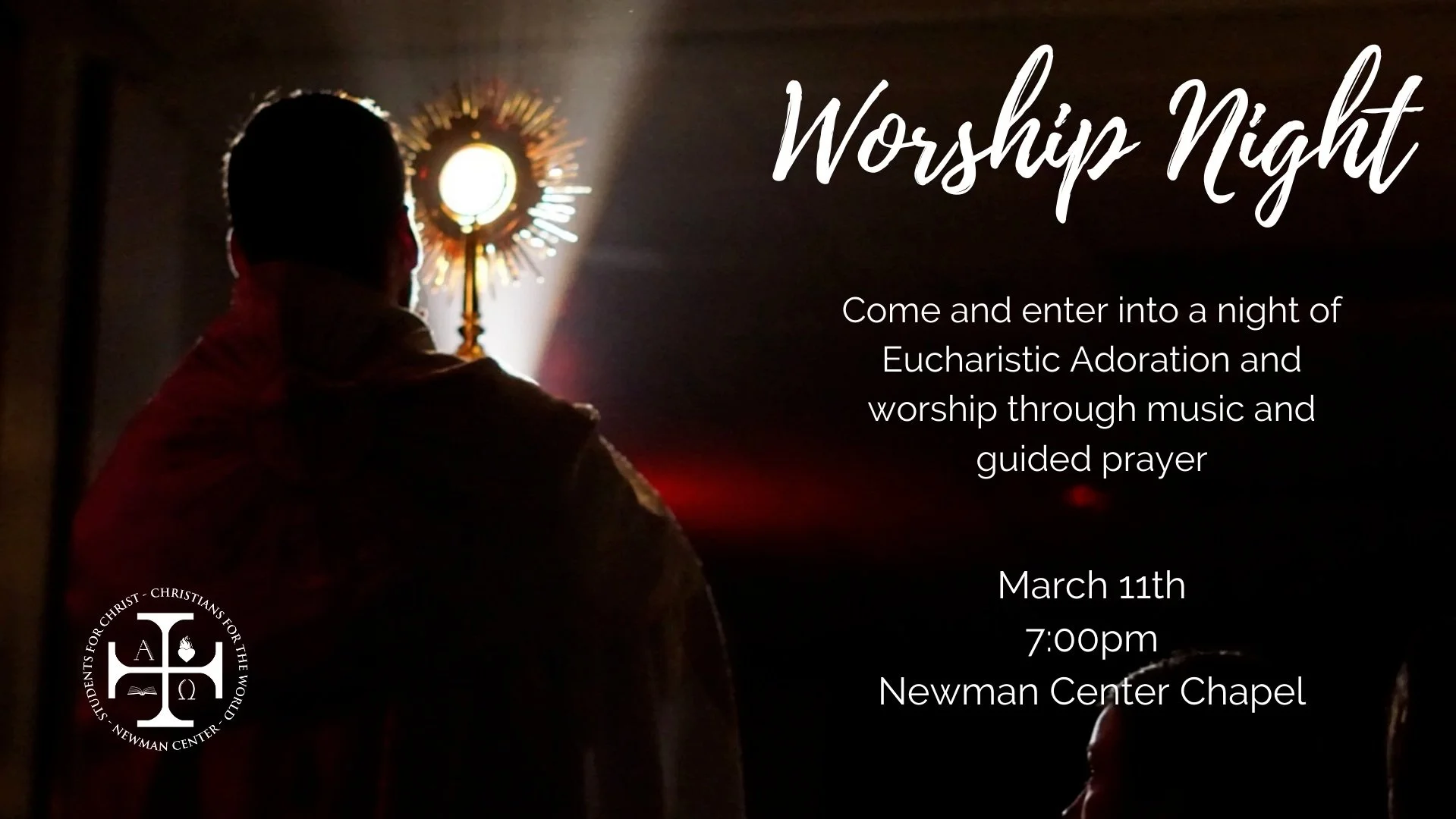 Worship Night Friday, March 11, 2022 7:00 PM 8:00 PM Newman Center Chapel 2127 NW Monroe Ave Corvallis, OR (map) Google Calendar ICS Come and enter into a night of worship through music and guided prayer. There will be Eucharistic Adoration and several praise and worship songs led our very own Worship Corp team.