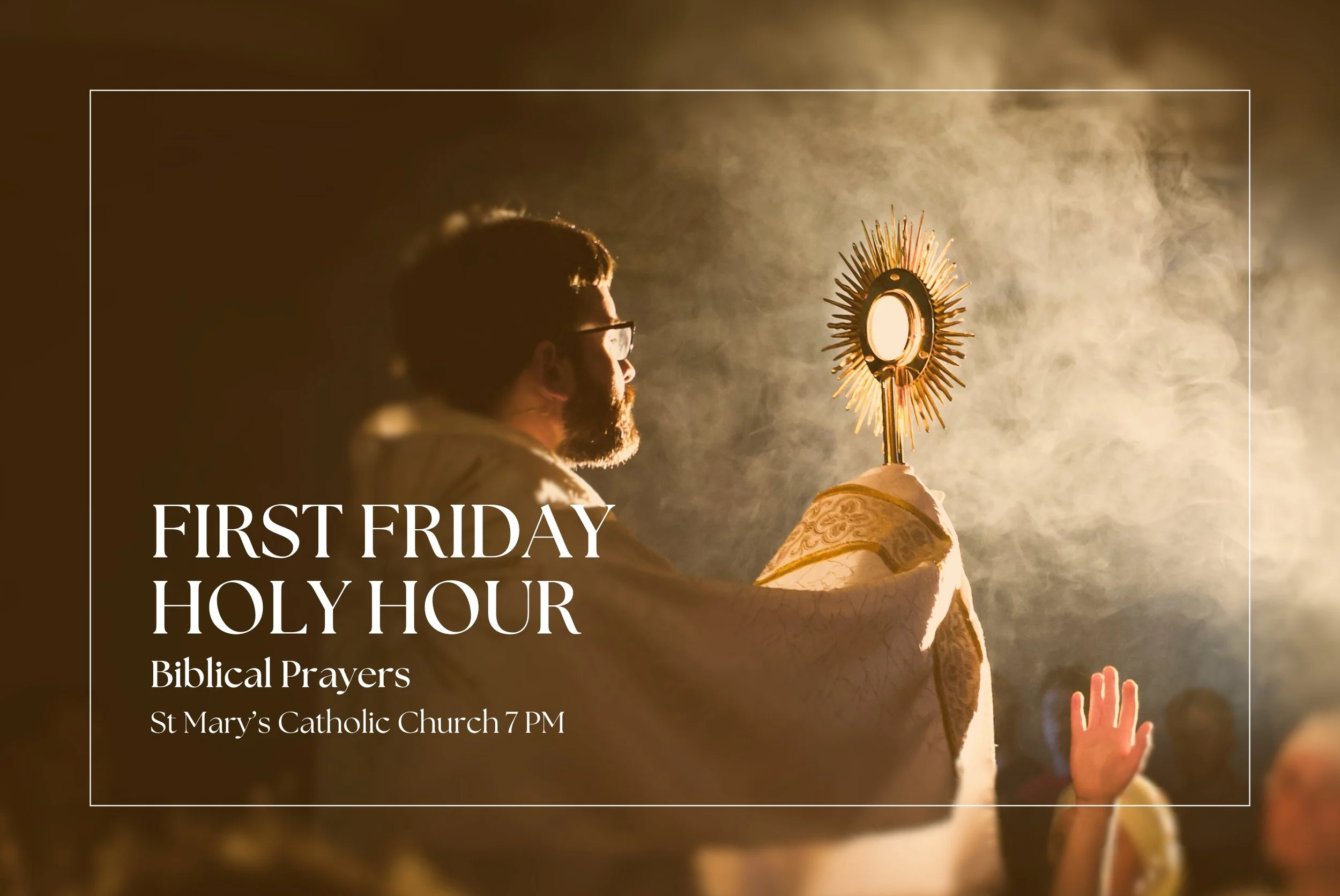 First Friday Holy Hour Friday, December 6, 2024 7:00 PM 8:00 PM 501 Northwest 25th Street Corvallis, OR, 97330 (map) Google Calendar ICS Join us every first Friday of the month 7 pm for Adoration of the Blessed Sacrament. Held at St. Mary Catholic Church Holy Hour includes guided prayer, music, and moments of silent refection
