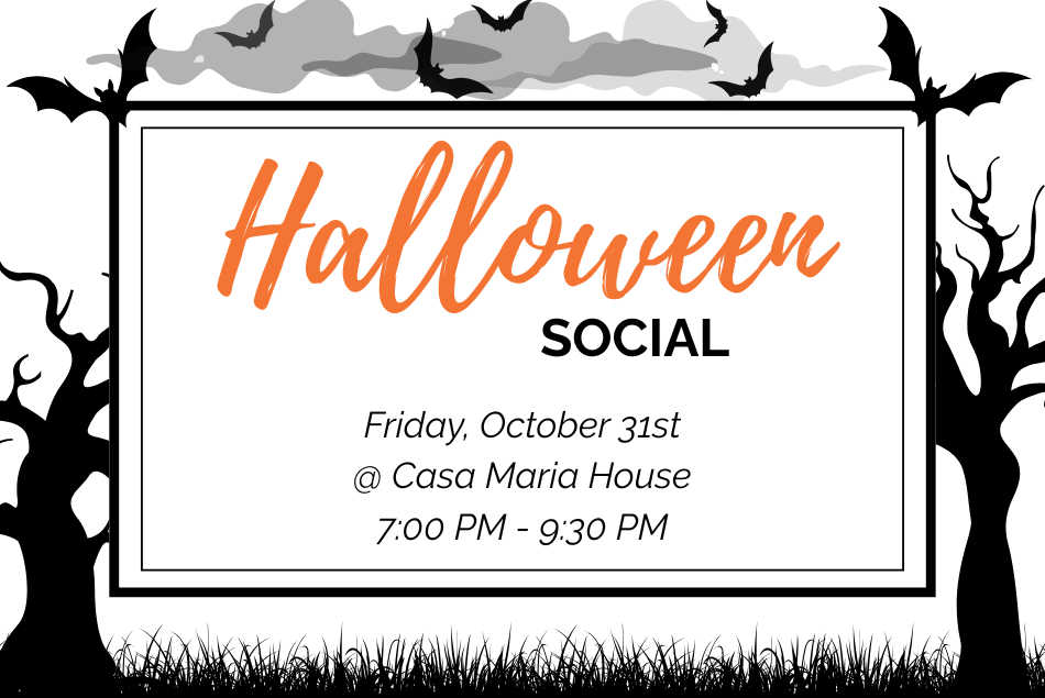 Halloween Social Friday, October 31, 2025 7:00 PM 9:30 PM Casa Maria (map) Google Calendar ICS Join us on Halloween for a night filled with costumes, music, treats, friends, and fun! If you would like to attend, contact Olivia (360) 844-0212 for the Casa Maria address.