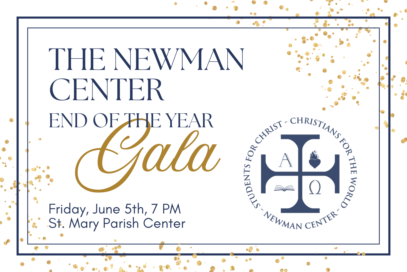 Newman Gala 2026 Friday, June 5, 2026 7:00 PM 9:20 PM St Mary's Parish Center 2127 Northwest Monroe Avenue Corvallis, OR, 97330 United States (map) Google Calendar ICS Join us for a final celebration of the year and sendoff for the Newman community! There will be dinner, awards, and much more, preceded by the First Friday Holy Hour. Make sure to RSVP at the link below to attend: RSVP here