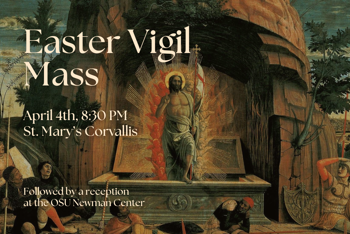 Easter Vigil Mass Saturday, April 4, 2026 8:30 PM Sunday, April 5, 2026 12:00 PM St Mary Catholic Church 501 Northwest 25th Street Corvallis, OR, 97330 United States (map) Google Calendar ICS Join us for our Easter Vigil this year to celebrate the risen Lord.There will be a reception to follow the Easter Vigil at the OSU Newman Center and a sunrise hike at Chip Ross. Check out more details at osunewman.org/holyweek.
